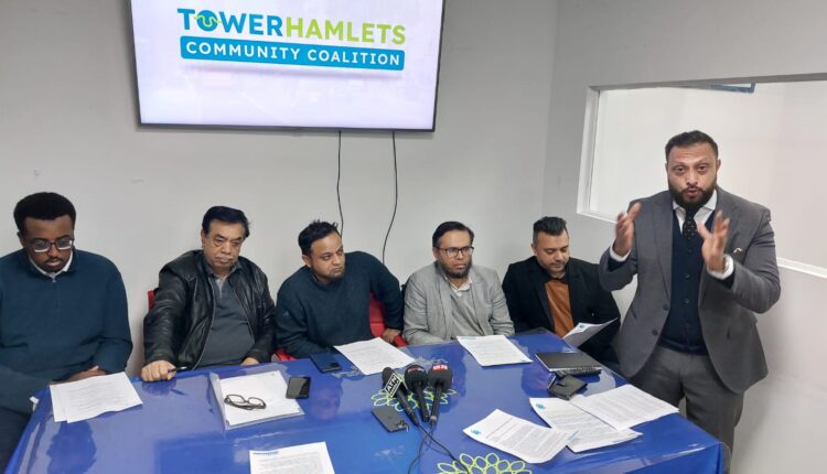 ৫ মার্চ মঙ্গলবার সন্ধ্যায় লন্ডন বাংলা প্রেস ক্লাবে আয়োজিত এই সংবাদ সম্মেলনে টাওয়ার হ্যামলেটস কমিউনিটি কোয়ালিশন-এর পক্ষে বক্তব্য রাখেন কমিউনিটি নেতা আব্দুশ শুকুর খালিসদার, সিরাজুল হক সিরাজ, আব্দুর রহমান ইসা, হাসান হক, হাফিজ মোশতাক আহমেদ, রুহুল তরফদার, হাফিজ মাওলানা শামসুল হক, ব্যারিস্টার আতাউর রহমান ও সালমাল ফার্সি।