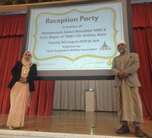 সেতু চৌধুরীঃ হাইড ওয়েলফেয়ার অ্যাসোসিয়েশনের বর্তমান চেয়ারম্যান বিশিষ্ট কমিউনিটি ব্যক্তিত্ব আবদুল মুসাব্বিরের বৃটেনের রাজা কতৃক এম বি ই খেতাব প্রাপ্তি ও Tameside-এর প্রথম বাঙালি কাউন্সিলার শিবলী আলম সিভিক্ মেয়র নির্বাচিত হওয়ায় হাইড বাংলাদেশ ওয়েলফেয়ার অ্যাসোসিয়েশন গতকাল হাইড টাউন হলে এক নাগরিক সংবর্ধনার আয়োজন করে।
